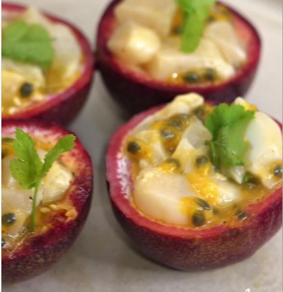 Dans un bol, mélangez délicatement les dés de Saint-Jacques avec la pulpe des fruits.